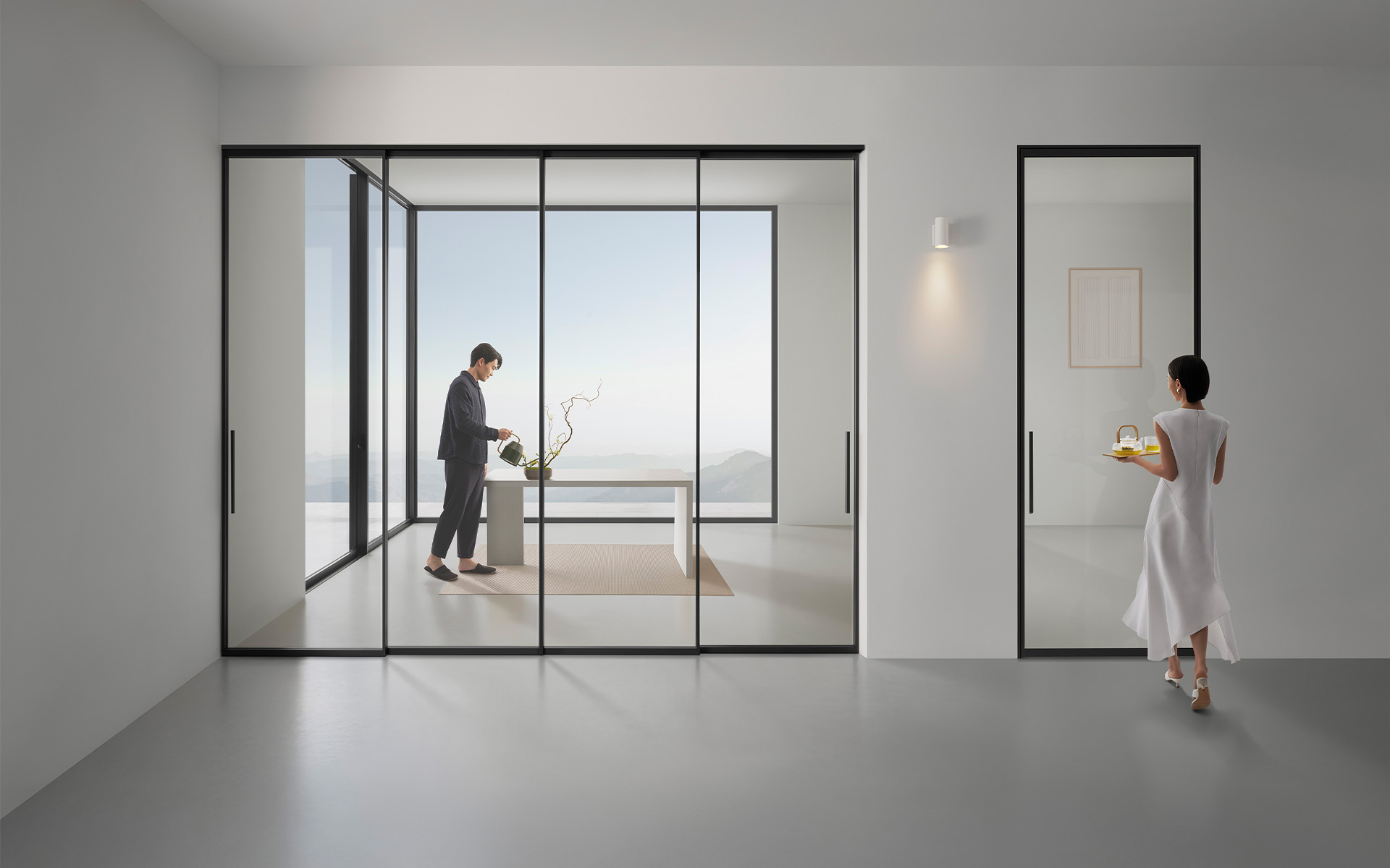 INTERIOR SERIES, a luxurious and durable choice to divide interior living spaces. Available are the hanging type without floor track and sliding type with floor track. Slim design aluminum profiles give a modern accent to your space.